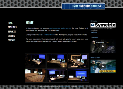 Undergroundsound is a post production sound facility in downtown Wellington, and a major change of pace for us.  We produced a site that is subdued while remaining strong in terms of design, rounded off by embedded YouTube content and an elegant, Flash-driven navigation system which recalls the faders so typical of recoding equipment.